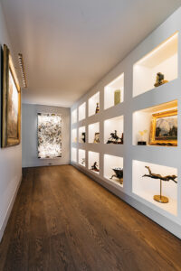 The 6-foot-wide hallways double as an art gallery with gridded alcoves that are each filled with notable pieces—all individually lit—from their collection. “It really is like living in an art gallery,” Pete said. “They have plein air paintings from the 1920s and some really beautiful pieces.”