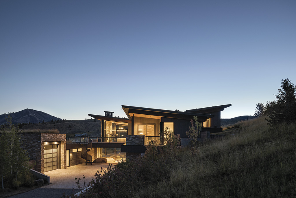 Dunfield picked the home’s lot in the White Clouds subdivision of Sun Valley for its views of the peaks in the area, as well as for its great sunlight during the winter months. Another vision for the house, which is located on a sloping hillside, was to integrate it with the surrounding landscape and to create a multilevel indoor-outdoor living experience.